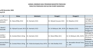 Pekanbaru, 29 Oktober 2025 – Fakultas Psikologi Universitas Islam Negeri (UIN) Sultan Syarif Kasim Riau akan menyelenggarakan rangkaian Seminar Hasil (Semhas) Tesis bagi mahasiswa Program Magister (S2) Psikologi pada Rabu, 5 November 2025, bertempat di Ruang S2 B Fakultas Psikologi UIN Suska Riau. Kegiatan ini dilaksanakan sebagai bagian dari tahapan …
