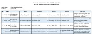 Kegiatan ini dilaksanakan sebagai bagian dari tahapan akademik mahasiswa sebelum menuju ujian tesis, sekaligus menjadi wadah evaluasi dan penguatan kualitas penelitian mahasiswa pascasarjana.