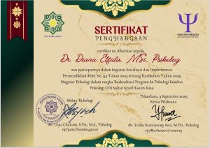 Pekanbaru, 3 September 2025 – Fakultas Psikologi UIN Sultan Syarif Kasim (UIN Suska) Riau melalui Program Magister Psikologi menyampaikan bahwa seluruh sertifikat kegiatan “Sosialisasi dan Implementasi Permendikbud Dikti No. 53 Tahun 2023 tentang Kurikulum Tahun 2025” telah selesai diproses dan diserahkan kepada para peserta.