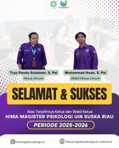 Pekanbaru, November 2025 — Himpunan Mahasiswa Magister Psikologi (HIMA Magister Psikologi) Universitas Islam Negeri Sultan Syarif Kasim (UIN Suska) Riau resmi memiliki kepengurusan baru. Dalam pemilihan yang berlangsung penuh semangat kekeluargaan, Tryo Pandu Sulaiman, S.Psi. terpilih sebagai Ketua Umum, dan Muhammad Ihsan, S.Psi. sebagai Wakil Ketua Umum untuk periode 2025–2026.